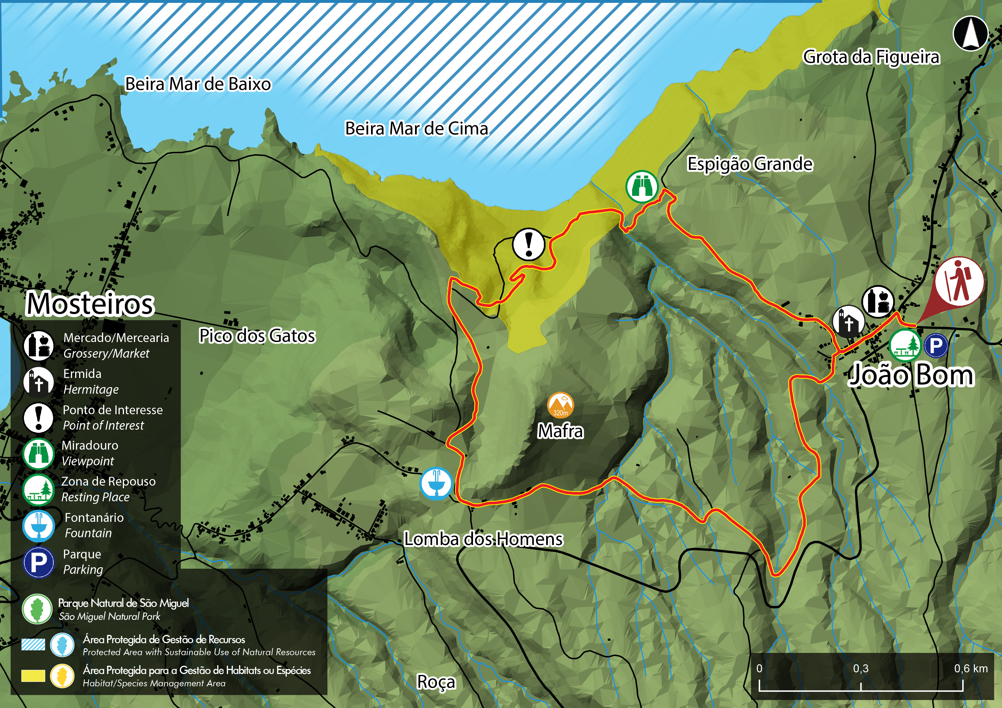 Mais adiante pode ainda desfrutar da beleza das pastagens, vegetação, e contemplar admiráveis paisagens sobre a costa da Bretanha, assim como avistar a freguesia dos Mosteiros. Continua-se o percurso e desce-se até chegar à Ribeira do João Bom, atravessando-a, à direita pode-se observar uma cascata e mais adiante à esquerda umas casas de captação de água. Seguindo em frente, podemos visualizar à direita, o caminho que vai dar à freguesia dos Mosteiros e, prosseguindo em frente na direção vemos o Pico de Mafra, com a sua rocha formada por bagacina vermelha, que dá o nome a este percurso. Chegamos à Rua direita do Pico de Mafra e seguimos à esquerda.